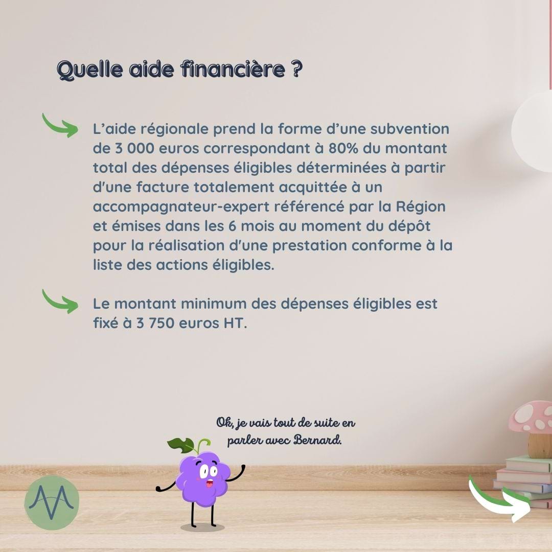 L’aide régionale prend la forme d’une subvention de 3 000 euros. Cela correspond à 80% du montant total des dépenses éligibles. Ces dernières sont déterminées à partir d’une facture totalement acquittée à un accompagnateur-expert référencé par la Région et émises dans les 6 mois au moment du dépôt pour la réalisation d’une prestation conforme à la liste des actions éligibles.