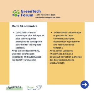 - 04/11 à 11h-11h45 : “Vers un numérique plus éthique et plus sobre : quelles pratiques de conception pour limiter les impacts sociaux ?” avec Elise Bideau (Open), Gwenaël Bourboulon (Insercall), Thibault Dugast (Collectif Translucide).