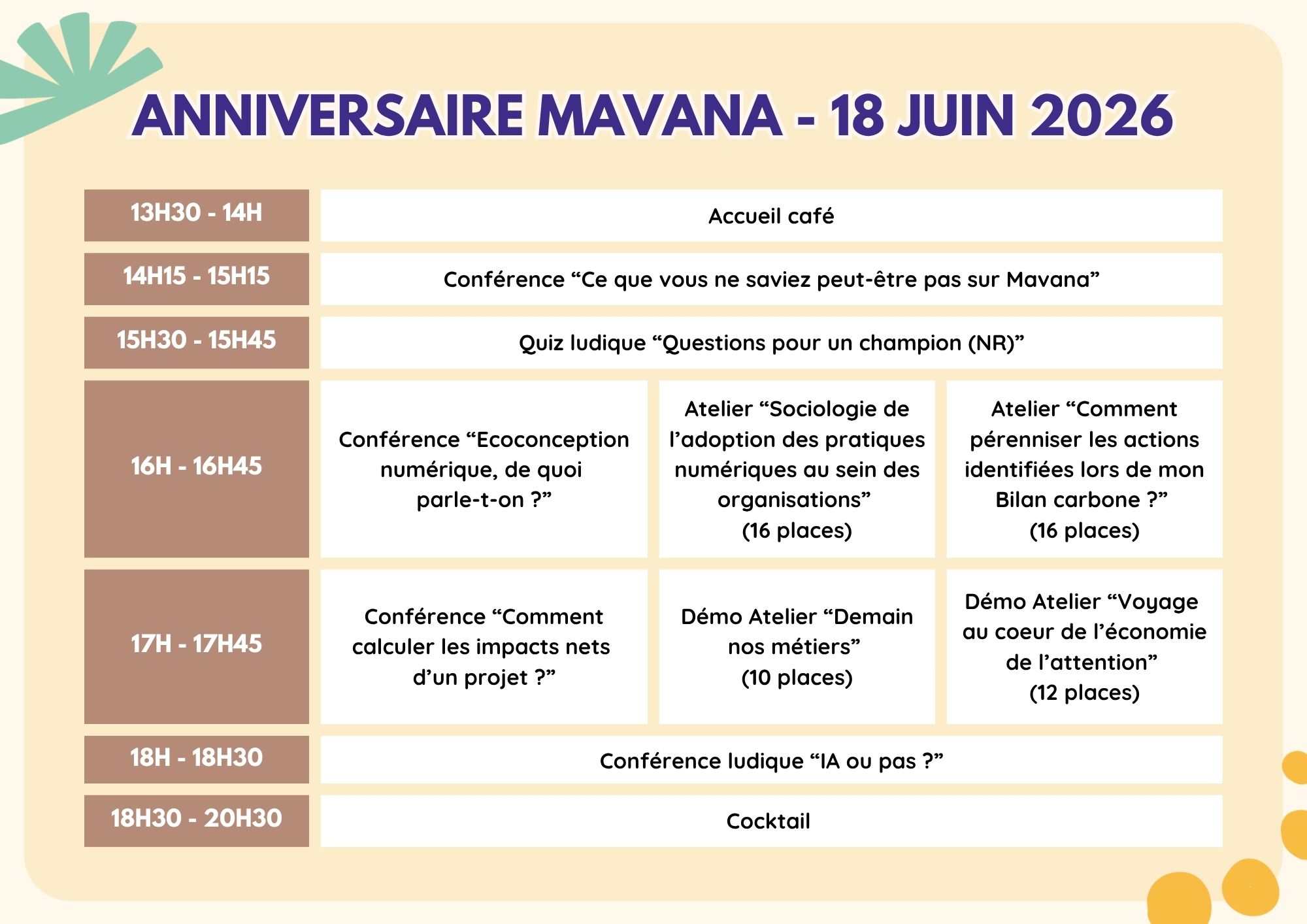 Vous souhaitez participer à la journée de conférences, d’ateliers et de moments de partage organisée par Mavana ? Vous êtes au bon endroit !