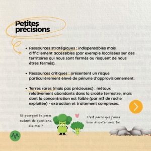 - Terres rares (mais pas précieuses) : métaux relativement abondants dans la croûte terrestre, mais dont la concentration est faible (par m3 de roche exploitée) – extraction et traitement complexes.