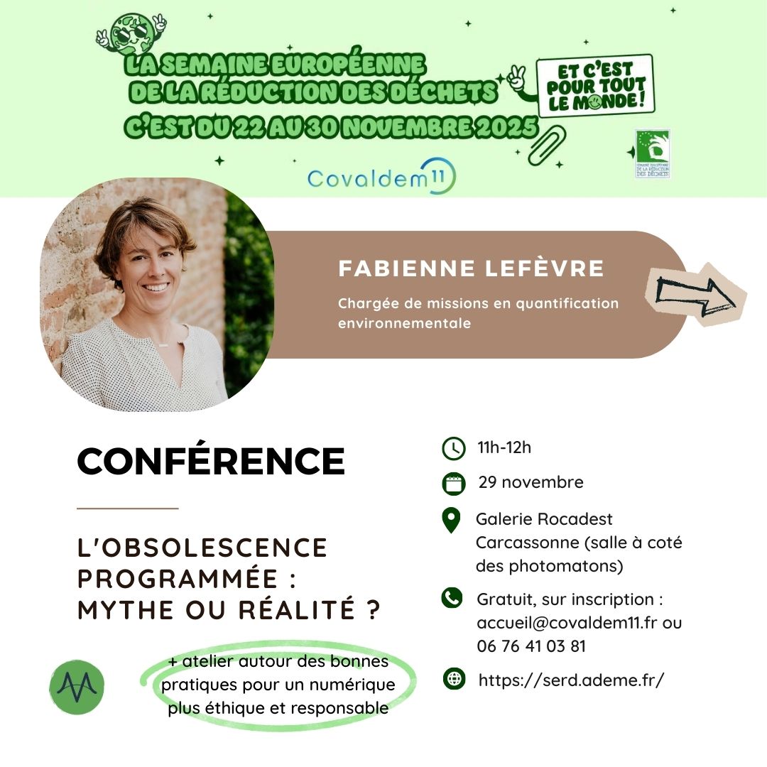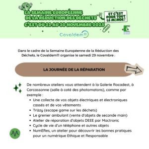 Dans le cadre de la Semaine Européenne de la Réduction des Déchets, le Covaldem11 organise la journée de la réparation. Retrouvez-y de nombreux ateliers, de jeux, d’animations… et la conférence de Fabienne “L’obsolescence programmée : mythe ou réalité ?” qui répondra à vos interrogations (événement gratuit sur inscription : accueil@covaldem11.fr).