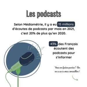 Selon Médiamétrie, il y a eu 15 millions d’écoutes de posdcasts par mois en 2021, c’est 20% de plus qu’en 2020. Et 43% des Français écoutent des podcasts pour s’informer.