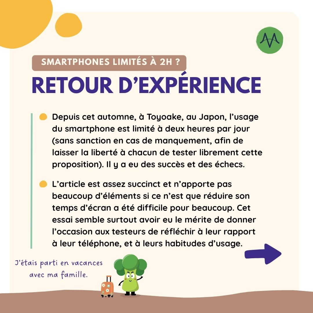 Depuis cet automne, à Toyoake, au Japon, l’usage du smartphone est limité à deux heures par jour (sans sanction en cas de manquement, afin de laisser la liberté à chacun de tester librement cette proposition). Il y a eu des succès et des échecs.