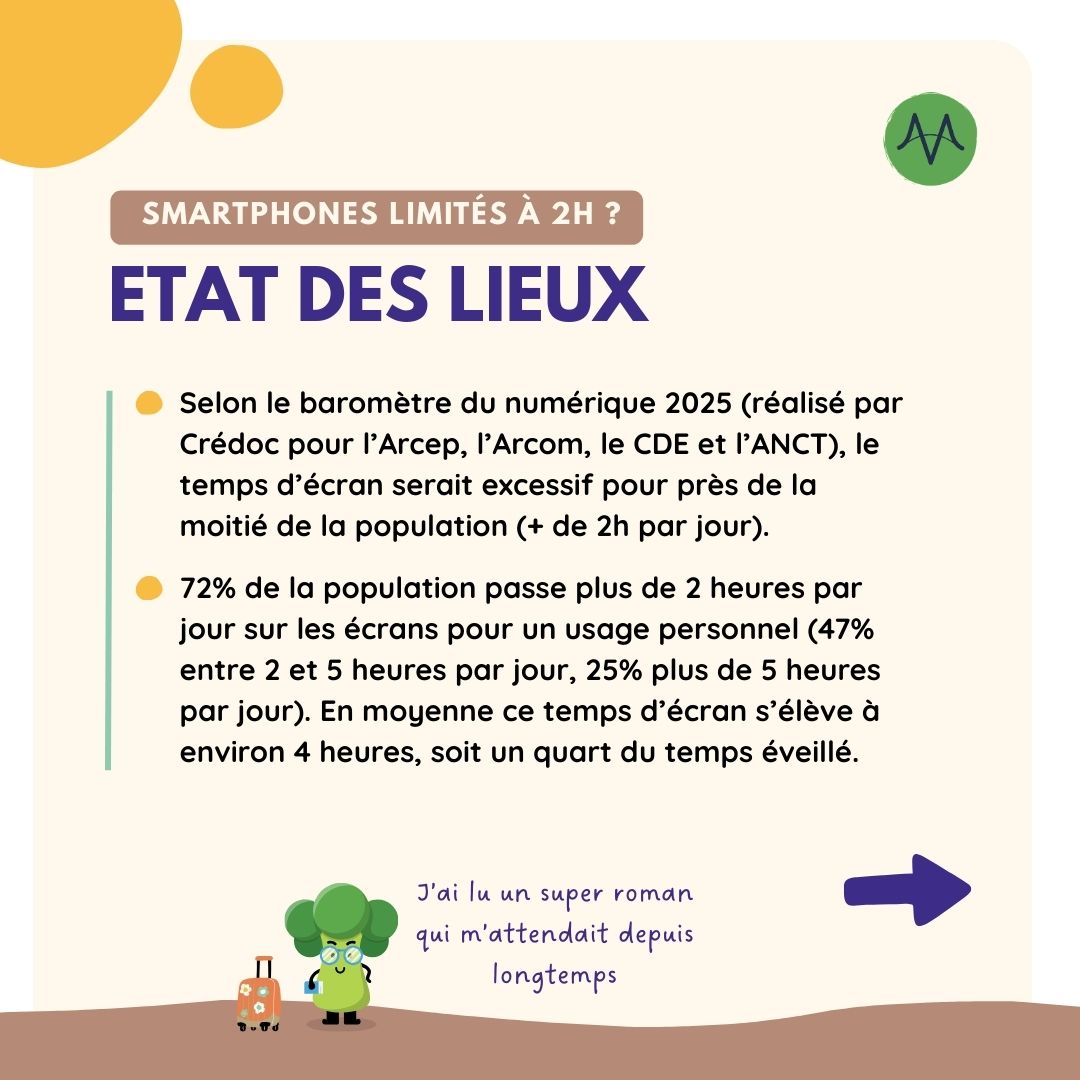 Selon le baromètre du numérique 2025 (réalisé par Crédoc pour l’Arcep, l’Arcom, le CDE et l’ANCT), le temps d’écran serait excessif pour près de la moitié de la population (+ de 2h par jour).
